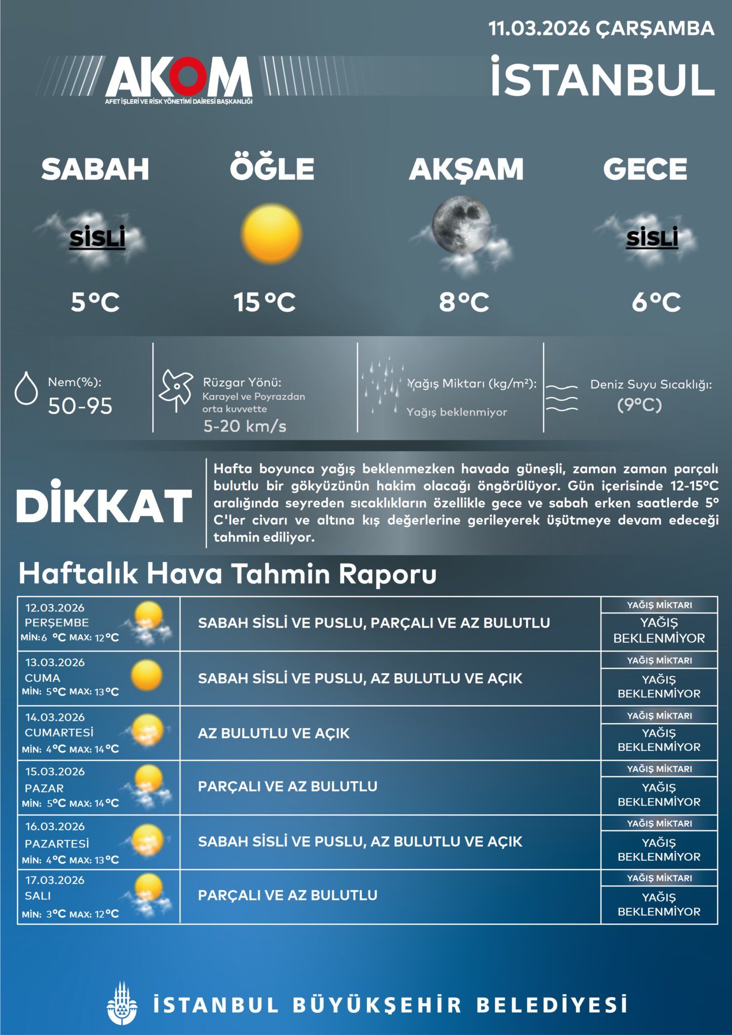 İstanbul Büyükşehir Belediyesi Afet İşleri Dairesi Başkanlığı AKOM’un yayımladığı hava tahmin raporuna göre, 11 Mart Çarşamba günü İstanbul’da sabah ve gece saatlerinde sis bekleniyor.